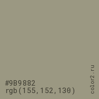 Цвет #9B9882 в цветовой модели RGB обозначается тремя октетами (155, 152, 130) в десятичном формате и #9B9882 в шестнадцатиричном (hex) формате, которые являются интенсивностью красного 155 (hex 9B), интенсивность зелёного 152 (hex 98) и интенсивность синего 130 (hex 82).