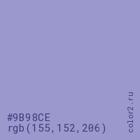 Цвет #9B98CE в цветовой модели RGB обозначается тремя октетами (155, 152, 206) в десятичном формате и #9B98CE в шестнадцатиричном (hex) формате, которые являются интенсивностью красного 155 (hex 9B), интенсивность зелёного 152 (hex 98) и интенсивность синего 206 (hex CE).