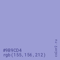 Цвет #9B9CD4 в цветовой модели RGB обозначается тремя октетами (155, 156, 212) в десятичном формате и #9B9CD4 в шестнадцатиричном (hex) формате, которые являются интенсивностью красного 155 (hex 9B), интенсивность зелёного 156 (hex 9C) и интенсивность синего 212 (hex D4).