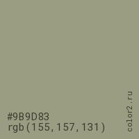 Цвет #9B9D83 в цветовой модели RGB обозначается тремя октетами (155, 157, 131) в десятичном формате и #9B9D83 в шестнадцатиричном (hex) формате, которые являются интенсивностью красного 155 (hex 9B), интенсивность зелёного 157 (hex 9D) и интенсивность синего 131 (hex 83).