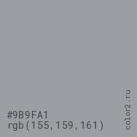 Цвет #9B9FA1 в цветовой модели RGB обозначается тремя октетами (155, 159, 161) в десятичном формате и #9B9FA1 в шестнадцатиричном (hex) формате, которые являются интенсивностью красного 155 (hex 9B), интенсивность зелёного 159 (hex 9F) и интенсивность синего 161 (hex A1).