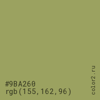 Цвет #9BA260 в цветовой модели RGB обозначается тремя октетами (155, 162, 96) в десятичном формате и #9BA260 в шестнадцатиричном (hex) формате, которые являются интенсивностью красного 155 (hex 9B), интенсивность зелёного 162 (hex A2) и интенсивность синего 96 (hex 60).