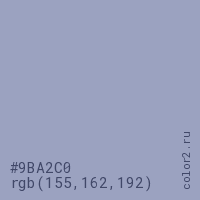 Цвет #9BA2C0 в цветовой модели RGB обозначается тремя октетами (155, 162, 192) в десятичном формате и #9BA2C0 в шестнадцатиричном (hex) формате, которые являются интенсивностью красного 155 (hex 9B), интенсивность зелёного 162 (hex A2) и интенсивность синего 192 (hex C0).