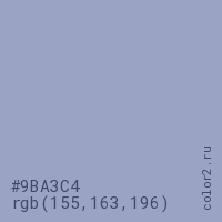 Цвет #9BA3C4 в цветовой модели RGB обозначается тремя октетами (155, 163, 196) в десятичном формате и #9BA3C4 в шестнадцатиричном (hex) формате, которые являются интенсивностью красного 155 (hex 9B), интенсивность зелёного 163 (hex A3) и интенсивность синего 196 (hex C4).