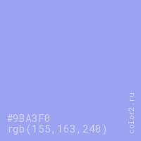 Цвет #9BA3F0 в цветовой модели RGB обозначается тремя октетами (155, 163, 240) в десятичном формате и #9BA3F0 в шестнадцатиричном (hex) формате, которые являются интенсивностью красного 155 (hex 9B), интенсивность зелёного 163 (hex A3) и интенсивность синего 240 (hex F0).