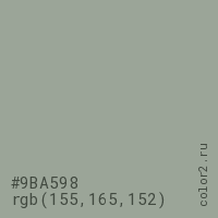 Цвет #9BA598 в цветовой модели RGB обозначается тремя октетами (155, 165, 152) в десятичном формате и #9BA598 в шестнадцатиричном (hex) формате, которые являются интенсивностью красного 155 (hex 9B), интенсивность зелёного 165 (hex A5) и интенсивность синего 152 (hex 98).