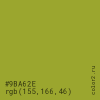 Цвет #9BA62E в цветовой модели RGB обозначается тремя октетами (155, 166, 46) в десятичном формате и #9BA62E в шестнадцатиричном (hex) формате, которые являются интенсивностью красного 155 (hex 9B), интенсивность зелёного 166 (hex A6) и интенсивность синего 46 (hex 2E).