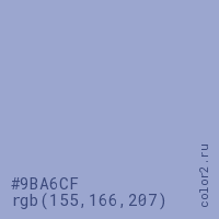 Цвет #9BA6CF в цветовой модели RGB обозначается тремя октетами (155, 166, 207) в десятичном формате и #9BA6CF в шестнадцатиричном (hex) формате, которые являются интенсивностью красного 155 (hex 9B), интенсивность зелёного 166 (hex A6) и интенсивность синего 207 (hex CF).