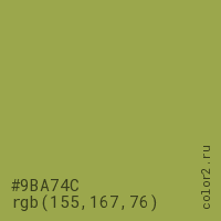 Цвет #9BA74C в цветовой модели RGB обозначается тремя октетами (155, 167, 76) в десятичном формате и #9BA74C в шестнадцатиричном (hex) формате, которые являются интенсивностью красного 155 (hex 9B), интенсивность зелёного 167 (hex A7) и интенсивность синего 76 (hex 4C).