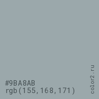 Цвет #9BA8AB в цветовой модели RGB обозначается тремя октетами (155, 168, 171) в десятичном формате и #9BA8AB в шестнадцатиричном (hex) формате, которые являются интенсивностью красного 155 (hex 9B), интенсивность зелёного 168 (hex A8) и интенсивность синего 171 (hex AB).