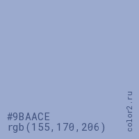 Цвет #9BAACE в цветовой модели RGB обозначается тремя октетами (155, 170, 206) в десятичном формате и #9BAACE в шестнадцатиричном (hex) формате, которые являются интенсивностью красного 155 (hex 9B), интенсивность зелёного 170 (hex AA) и интенсивность синего 206 (hex CE).