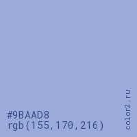 Цвет #9BAAD8 в цветовой модели RGB обозначается тремя октетами (155, 170, 216) в десятичном формате и #9BAAD8 в шестнадцатиричном (hex) формате, которые являются интенсивностью красного 155 (hex 9B), интенсивность зелёного 170 (hex AA) и интенсивность синего 216 (hex D8).