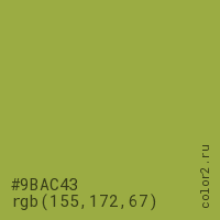 Цвет #9BAC43 в цветовой модели RGB обозначается тремя октетами (155, 172, 67) в десятичном формате и #9BAC43 в шестнадцатиричном (hex) формате, которые являются интенсивностью красного 155 (hex 9B), интенсивность зелёного 172 (hex AC) и интенсивность синего 67 (hex 43).