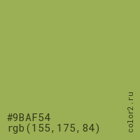 Цвет #9BAF54 в цветовой модели RGB обозначается тремя октетами (155, 175, 84) в десятичном формате и #9BAF54 в шестнадцатиричном (hex) формате, которые являются интенсивностью красного 155 (hex 9B), интенсивность зелёного 175 (hex AF) и интенсивность синего 84 (hex 54).
