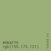 Цвет #9BAF79 в цветовой модели RGB обозначается тремя октетами (155, 175, 121) в десятичном формате и #9BAF79 в шестнадцатиричном (hex) формате, которые являются интенсивностью красного 155 (hex 9B), интенсивность зелёного 175 (hex AF) и интенсивность синего 121 (hex 79).