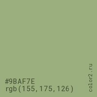 Цвет #9BAF7E в цветовой модели RGB обозначается тремя октетами (155, 175, 126) в десятичном формате и #9BAF7E в шестнадцатиричном (hex) формате, которые являются интенсивностью красного 155 (hex 9B), интенсивность зелёного 175 (hex AF) и интенсивность синего 126 (hex 7E).