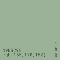 Цвет #9BB298 в цветовой модели RGB обозначается тремя октетами (155, 178, 152) в десятичном формате и #9BB298 в шестнадцатиричном (hex) формате, которые являются интенсивностью красного 155 (hex 9B), интенсивность зелёного 178 (hex B2) и интенсивность синего 152 (hex 98).