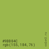 Цвет #9BB84C в цветовой модели RGB обозначается тремя октетами (155, 184, 76) в десятичном формате и #9BB84C в шестнадцатиричном (hex) формате, которые являются интенсивностью красного 155 (hex 9B), интенсивность зелёного 184 (hex B8) и интенсивность синего 76 (hex 4C).