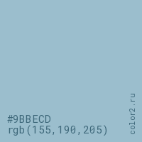 Цвет #9BBECD в цветовой модели RGB обозначается тремя октетами (155, 190, 205) в десятичном формате и #9BBECD в шестнадцатиричном (hex) формате, которые являются интенсивностью красного 155 (hex 9B), интенсивность зелёного 190 (hex BE) и интенсивность синего 205 (hex CD).