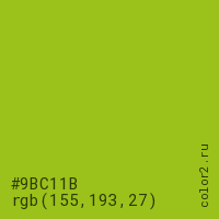 Цвет #9BC11B в цветовой модели RGB обозначается тремя октетами (155, 193, 27) в десятичном формате и #9BC11B в шестнадцатиричном (hex) формате, которые являются интенсивностью красного 155 (hex 9B), интенсивность зелёного 193 (hex C1) и интенсивность синего 27 (hex 1B).