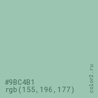 Цвет #9BC4B1 в цветовой модели RGB обозначается тремя октетами (155, 196, 177) в десятичном формате и #9BC4B1 в шестнадцатиричном (hex) формате, которые являются интенсивностью красного 155 (hex 9B), интенсивность зелёного 196 (hex C4) и интенсивность синего 177 (hex B1).