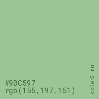 Цвет #9BC597 в цветовой модели RGB обозначается тремя октетами (155, 197, 151) в десятичном формате и #9BC597 в шестнадцатиричном (hex) формате, которые являются интенсивностью красного 155 (hex 9B), интенсивность зелёного 197 (hex C5) и интенсивность синего 151 (hex 97).