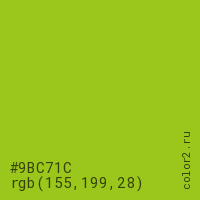 Цвет #9BC71C в цветовой модели RGB обозначается тремя октетами (155, 199, 28) в десятичном формате и #9BC71C в шестнадцатиричном (hex) формате, которые являются интенсивностью красного 155 (hex 9B), интенсивность зелёного 199 (hex C7) и интенсивность синего 28 (hex 1C).