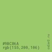 Цвет #9BC86A в цветовой модели RGB обозначается тремя октетами (155, 200, 106) в десятичном формате и #9BC86A в шестнадцатиричном (hex) формате, которые являются интенсивностью красного 155 (hex 9B), интенсивность зелёного 200 (hex C8) и интенсивность синего 106 (hex 6A).