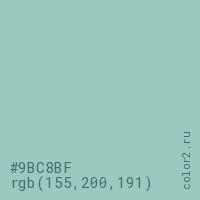 Цвет #9BC8BF в цветовой модели RGB обозначается тремя октетами (155, 200, 191) в десятичном формате и #9BC8BF в шестнадцатиричном (hex) формате, которые являются интенсивностью красного 155 (hex 9B), интенсивность зелёного 200 (hex C8) и интенсивность синего 191 (hex BF).