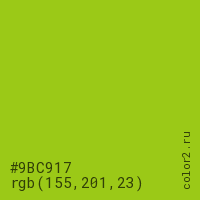 Цвет #9BC917 в цветовой модели RGB обозначается тремя октетами (155, 201, 23) в десятичном формате и #9BC917 в шестнадцатиричном (hex) формате, которые являются интенсивностью красного 155 (hex 9B), интенсивность зелёного 201 (hex C9) и интенсивность синего 23 (hex 17).