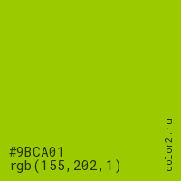 Цвет #9BCA01 в цветовой модели RGB обозначается тремя октетами (155, 202, 1) в десятичном формате и #9BCA01 в шестнадцатиричном (hex) формате, которые являются интенсивностью красного 155 (hex 9B), интенсивность зелёного 202 (hex CA) и интенсивность синего 1 (hex 01).