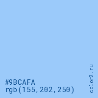 Цвет #9BCAFA в цветовой модели RGB обозначается тремя октетами (155, 202, 250) в десятичном формате и #9BCAFA в шестнадцатиричном (hex) формате, которые являются интенсивностью красного 155 (hex 9B), интенсивность зелёного 202 (hex CA) и интенсивность синего 250 (hex FA).
