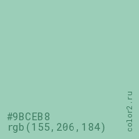 Цвет #9BCEB8 в цветовой модели RGB обозначается тремя октетами (155, 206, 184) в десятичном формате и #9BCEB8 в шестнадцатиричном (hex) формате, которые являются интенсивностью красного 155 (hex 9B), интенсивность зелёного 206 (hex CE) и интенсивность синего 184 (hex B8).