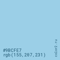 Цвет #9BCFE7 в цветовой модели RGB обозначается тремя октетами (155, 207, 231) в десятичном формате и #9BCFE7 в шестнадцатиричном (hex) формате, которые являются интенсивностью красного 155 (hex 9B), интенсивность зелёного 207 (hex CF) и интенсивность синего 231 (hex E7).