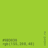 Цвет #9BD030 в цветовой модели RGB обозначается тремя октетами (155, 208, 48) в десятичном формате и #9BD030 в шестнадцатиричном (hex) формате, которые являются интенсивностью красного 155 (hex 9B), интенсивность зелёного 208 (hex D0) и интенсивность синего 48 (hex 30).