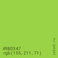 Цвет #9BD347 в цветовой модели RGB обозначается тремя октетами (155, 211, 71) в десятичном формате и #9BD347 в шестнадцатиричном (hex) формате, которые являются интенсивностью красного 155 (hex 9B), интенсивность зелёного 211 (hex D3) и интенсивность синего 71 (hex 47).