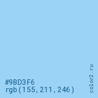 Цвет #9BD3F6 в цветовой модели RGB обозначается тремя октетами (155, 211, 246) в десятичном формате и #9BD3F6 в шестнадцатиричном (hex) формате, которые являются интенсивностью красного 155 (hex 9B), интенсивность зелёного 211 (hex D3) и интенсивность синего 246 (hex F6).