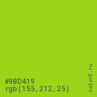 Цвет #9BD419 в цветовой модели RGB обозначается тремя октетами (155, 212, 25) в десятичном формате и #9BD419 в шестнадцатиричном (hex) формате, которые являются интенсивностью красного 155 (hex 9B), интенсивность зелёного 212 (hex D4) и интенсивность синего 25 (hex 19).