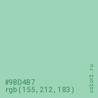 Цвет #9BD4B7 в цветовой модели RGB обозначается тремя октетами (155, 212, 183) в десятичном формате и #9BD4B7 в шестнадцатиричном (hex) формате, которые являются интенсивностью красного 155 (hex 9B), интенсивность зелёного 212 (hex D4) и интенсивность синего 183 (hex B7).