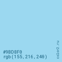 Цвет #9BD8F0 в цветовой модели RGB обозначается тремя октетами (155, 216, 240) в десятичном формате и #9BD8F0 в шестнадцатиричном (hex) формате, которые являются интенсивностью красного 155 (hex 9B), интенсивность зелёного 216 (hex D8) и интенсивность синего 240 (hex F0).