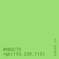 Цвет #9BDC73 в цветовой модели RGB обозначается тремя октетами (155, 220, 115) в десятичном формате и #9BDC73 в шестнадцатиричном (hex) формате, которые являются интенсивностью красного 155 (hex 9B), интенсивность зелёного 220 (hex DC) и интенсивность синего 115 (hex 73).