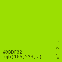 Цвет #9BDF02 в цветовой модели RGB обозначается тремя октетами (155, 223, 2) в десятичном формате и #9BDF02 в шестнадцатиричном (hex) формате, которые являются интенсивностью красного 155 (hex 9B), интенсивность зелёного 223 (hex DF) и интенсивность синего 2 (hex 02).