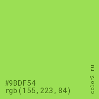 Цвет #9BDF54 в цветовой модели RGB обозначается тремя октетами (155, 223, 84) в десятичном формате и #9BDF54 в шестнадцатиричном (hex) формате, которые являются интенсивностью красного 155 (hex 9B), интенсивность зелёного 223 (hex DF) и интенсивность синего 84 (hex 54).