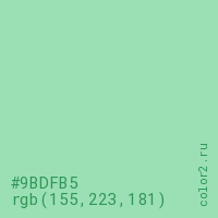 Цвет #9BDFB5 в цветовой модели RGB обозначается тремя октетами (155, 223, 181) в десятичном формате и #9BDFB5 в шестнадцатиричном (hex) формате, которые являются интенсивностью красного 155 (hex 9B), интенсивность зелёного 223 (hex DF) и интенсивность синего 181 (hex B5).