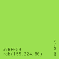 Цвет #9BE050 в цветовой модели RGB обозначается тремя октетами (155, 224, 80) в десятичном формате и #9BE050 в шестнадцатиричном (hex) формате, которые являются интенсивностью красного 155 (hex 9B), интенсивность зелёного 224 (hex E0) и интенсивность синего 80 (hex 50).