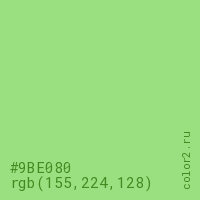 Цвет #9BE080 в цветовой модели RGB обозначается тремя октетами (155, 224, 128) в десятичном формате и #9BE080 в шестнадцатиричном (hex) формате, которые являются интенсивностью красного 155 (hex 9B), интенсивность зелёного 224 (hex E0) и интенсивность синего 128 (hex 80).