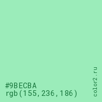 Цвет #9BECBA в цветовой модели RGB обозначается тремя октетами (155, 236, 186) в десятичном формате и #9BECBA в шестнадцатиричном (hex) формате, которые являются интенсивностью красного 155 (hex 9B), интенсивность зелёного 236 (hex EC) и интенсивность синего 186 (hex BA).