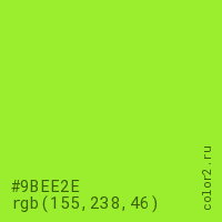 Цвет #9BEE2E в цветовой модели RGB обозначается тремя октетами (155, 238, 46) в десятичном формате и #9BEE2E в шестнадцатиричном (hex) формате, которые являются интенсивностью красного 155 (hex 9B), интенсивность зелёного 238 (hex EE) и интенсивность синего 46 (hex 2E).