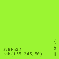 Цвет #9BF532 в цветовой модели RGB обозначается тремя октетами (155, 245, 50) в десятичном формате и #9BF532 в шестнадцатиричном (hex) формате, которые являются интенсивностью красного 155 (hex 9B), интенсивность зелёного 245 (hex F5) и интенсивность синего 50 (hex 32).