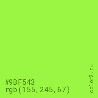 Цвет #9BF543 в цветовой модели RGB обозначается тремя октетами (155, 245, 67) в десятичном формате и #9BF543 в шестнадцатиричном (hex) формате, которые являются интенсивностью красного 155 (hex 9B), интенсивность зелёного 245 (hex F5) и интенсивность синего 67 (hex 43).